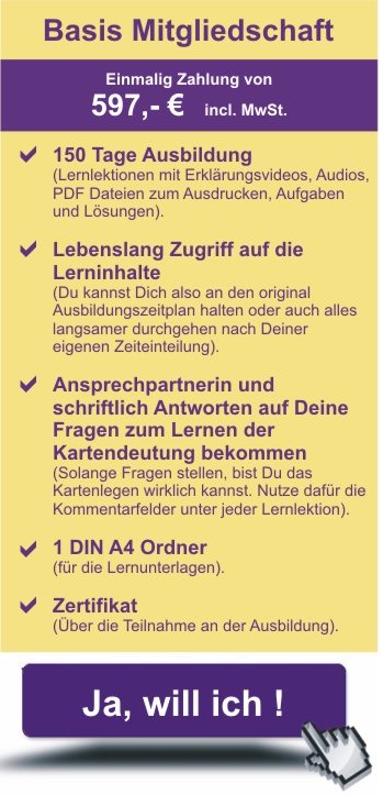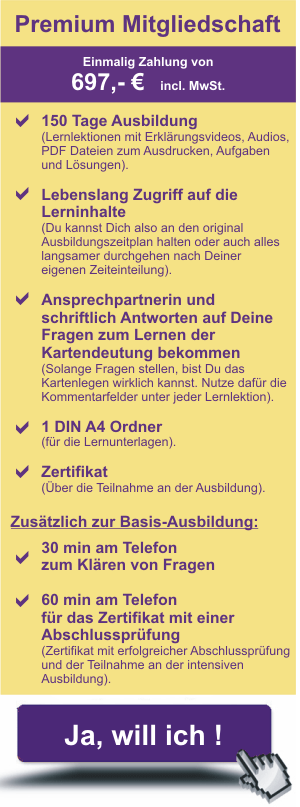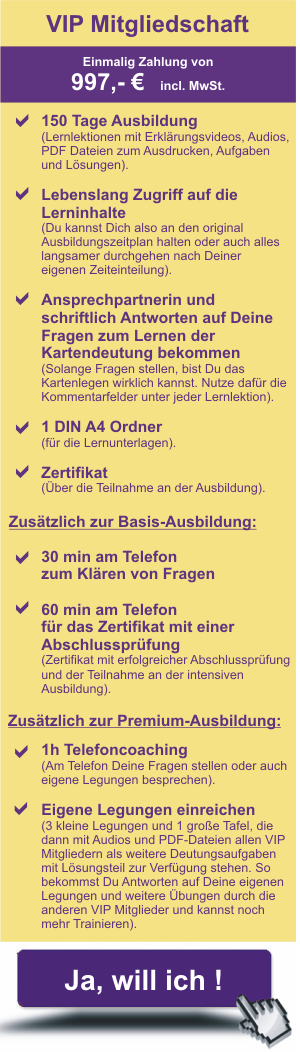Ich bringe Dir eine Deutungsmethode bei, mit der Du endlich Antworten in den Karten erkennst und selbst zu einem Experten in der Lebensberatung wirst.